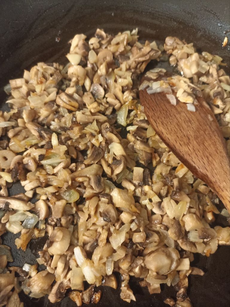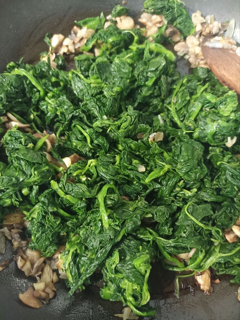 In una padella fate soffriggere in due cucchiai d’olio la cipolla affettata sottilmente. Quando è ben dorata aggiungete l’aglio tritato e i funghi. Fate rosolare per 4-5 minuti, aggiungete quindi gli spinaci ben strizzati, salate e fateli insaporire per altri 2-3 minuti.Lasciate intiepidire gli spinaci e trasferiteli in una ciotola.