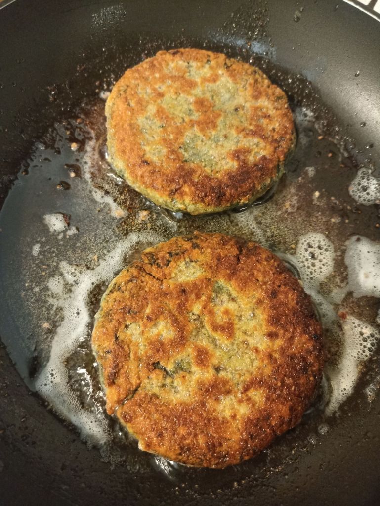 Dorate gli hamburger di spinaci in una padella con olio caldo a fuoco medio per 3 minuti per lato, finché non saranno ben dorati su entrambi i lati.