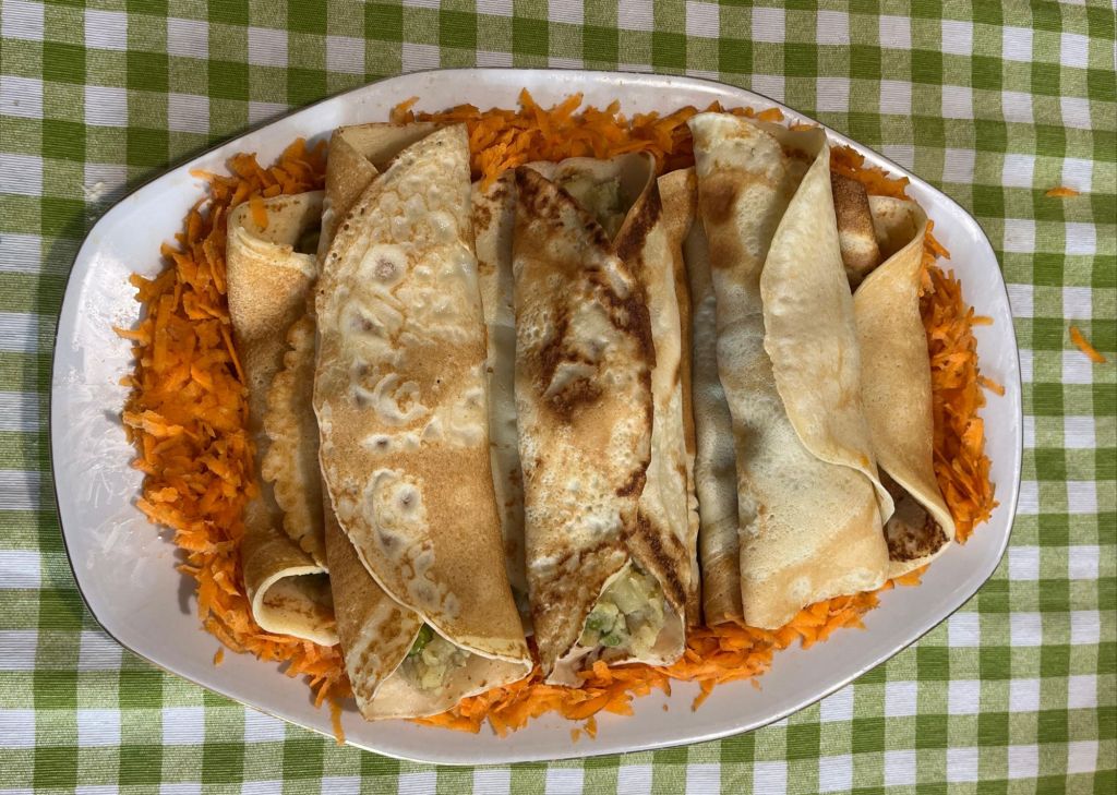 Distribuite al centro di ciascuna frittatina 2 cucchiai di composto di patate e piselli caldi, arrotolate e servite.