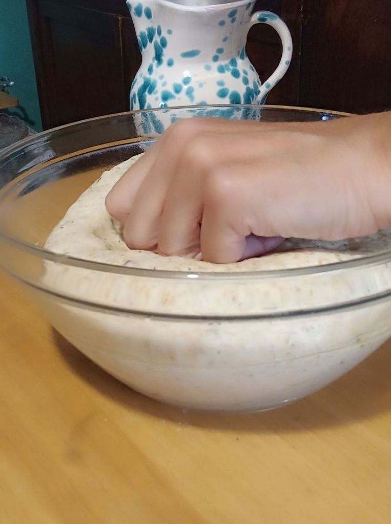 Appiattite l’impasto con il pugno chiuso della mano e fate lievitare per altri 30 minuti.