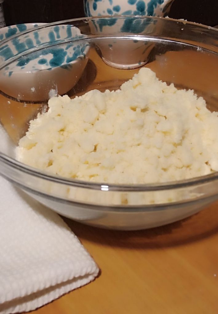 Aggiungete la vaniglia, un cucchiaio d’acqua, il burro tagliato a cubetti freddo e, con la punta delle dita, lavorate il tutto fino a ottenere un composto sabbiato, simile a delle grosse briciole.