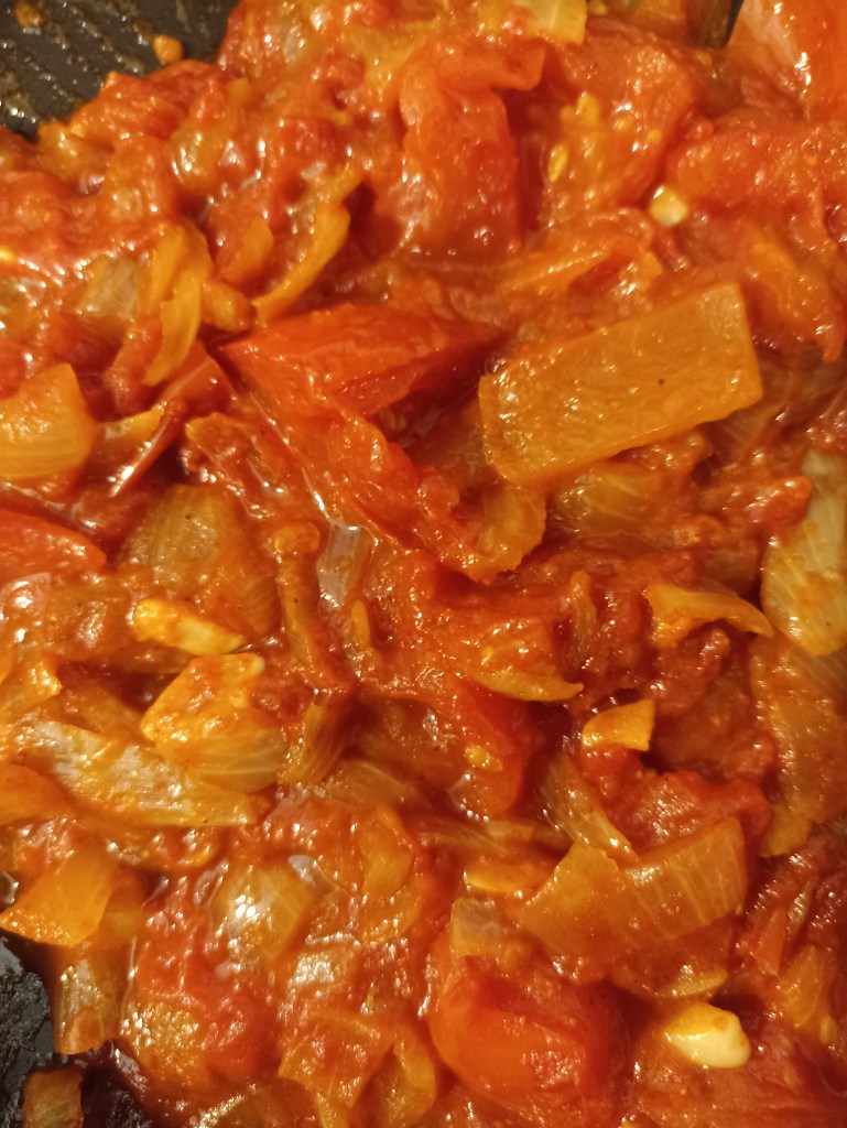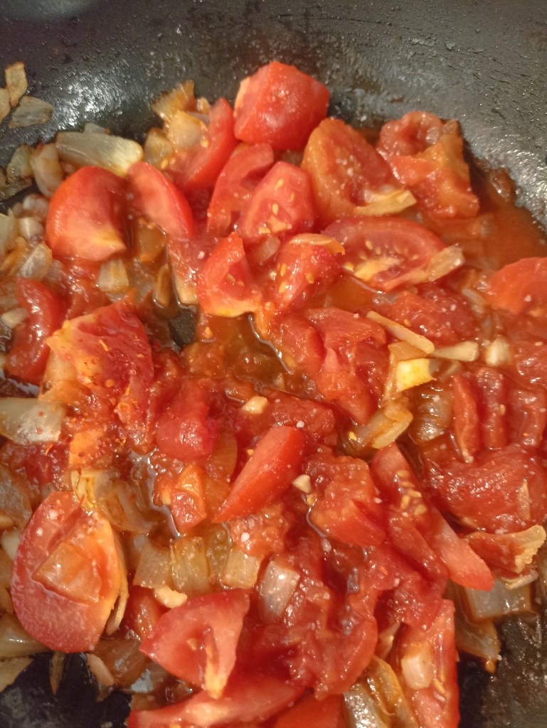 In una padella fate rosolare in due cucchiai d’olio la cipolla affettata sottilmente. Quando è ben dorata, aggiungete l’aglio tritato e, dopo un attimo, i pomodori, un pizzico di peperoncino, il sale e le spezie. Fate cuocere per 5 minuti, poi lasciate intiepidire.