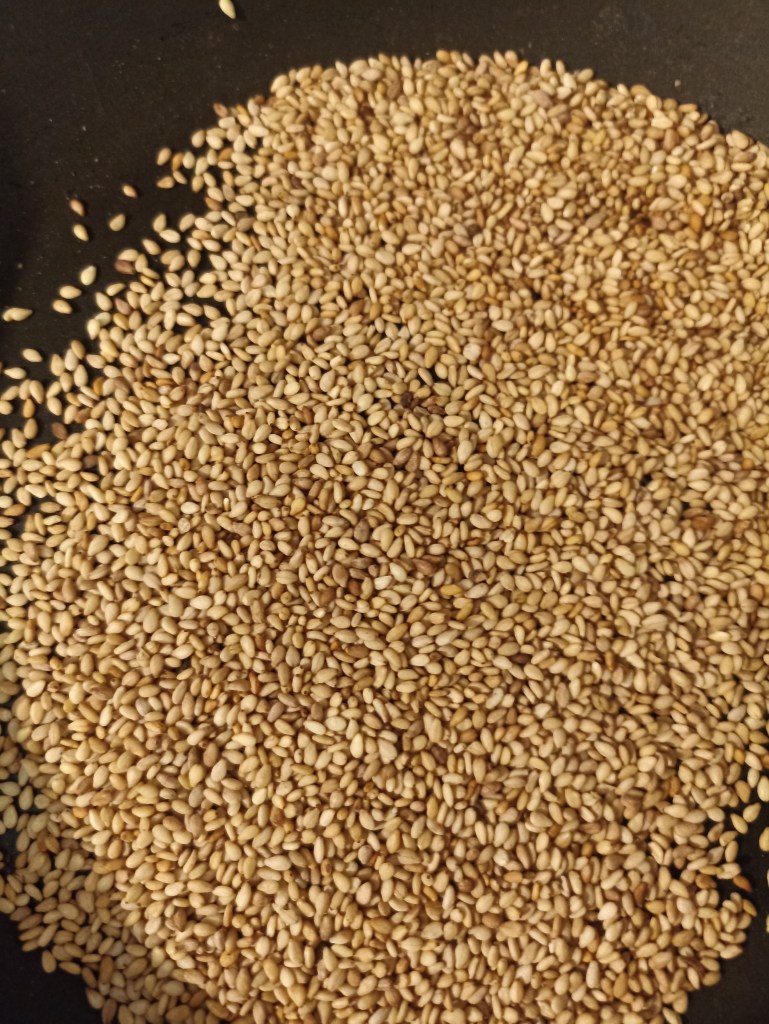 In una piccola padella fate tostare alcuni minuti i semi di sesamo a fuoco basso, mescolate con un cucchiaio di legno per non farli bruciare.