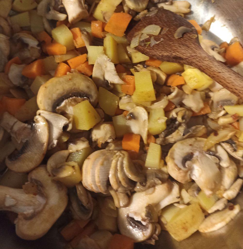 In una casseruola fate soffriggere in 3 cucchiai d’olio la cipolla affettata sottilmente, quando è ben dorata, aggiungete un pizzico di peperoncino, l’aglio tritato, lo zenzero e la curcuma, fate rosolare per 1 minuto. Unite i funghi, la carota e le patate, lasciate insaporire per 5 minuti a fuoco medio.