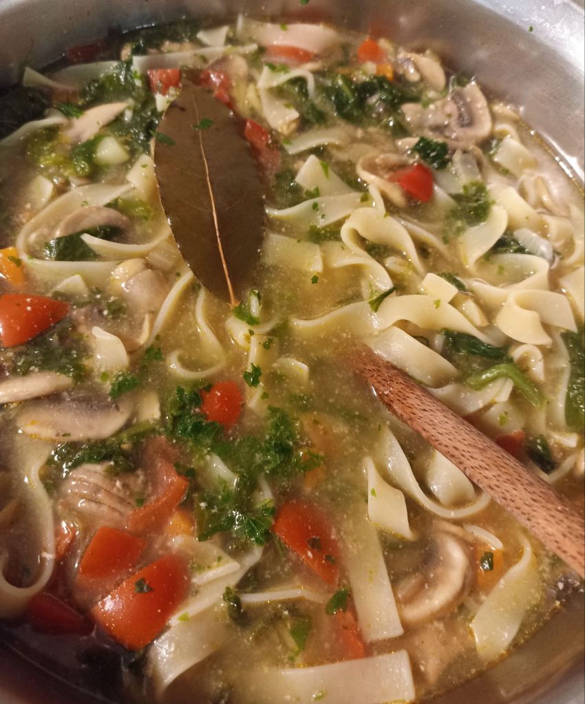 Aggiungete alla zuppa i noodles e gli spinaci freschi. Appena riprende il bollore lasciate cuocere a fuoco basso per 3 minuti.