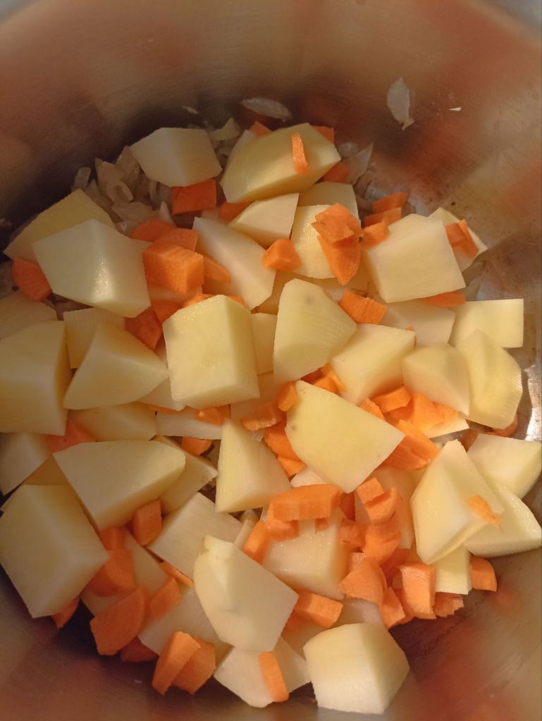 In una casseruola dal fondo spesso, fate soffriggere in 3 cucchiai d’olio la cipolla tritata. Aggiungete la carota e le patate, lasciatele rosolare per 2-3 minuti, poi salate, pepate e unite il brodo caldo.