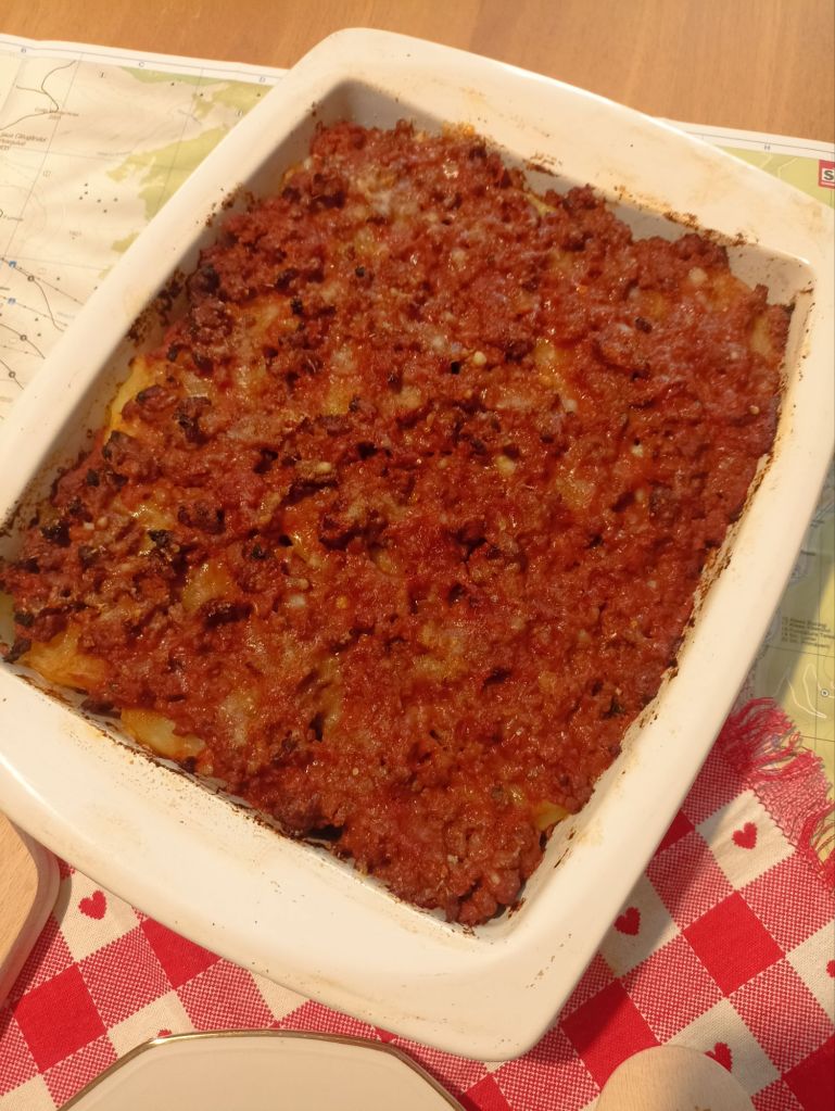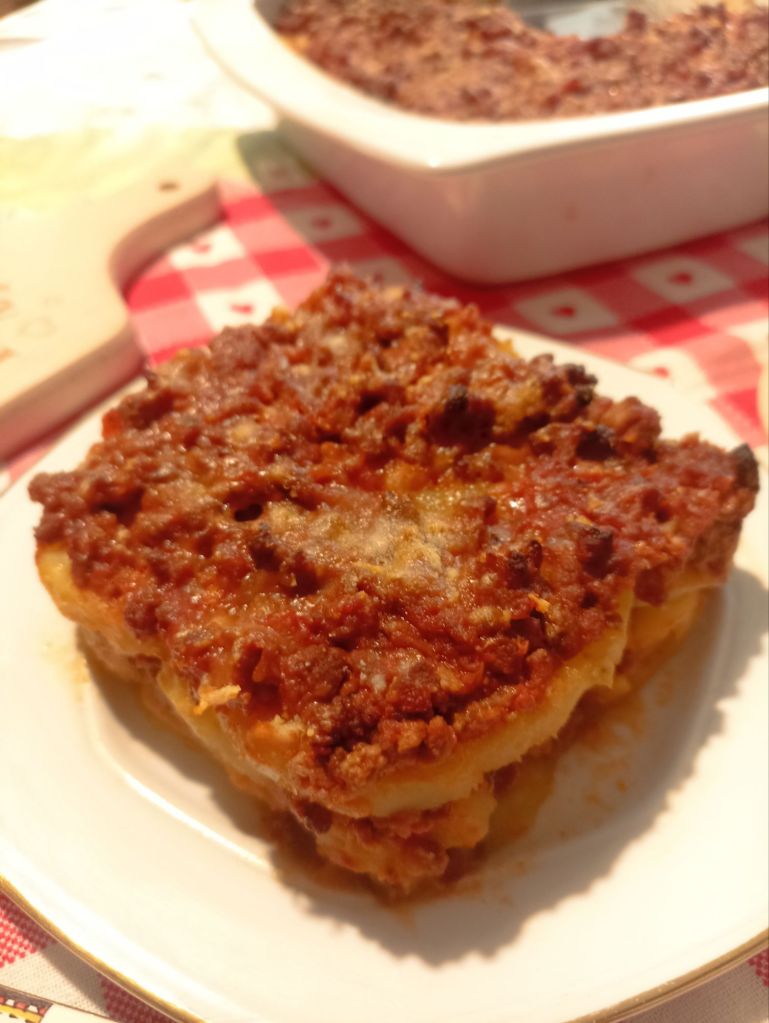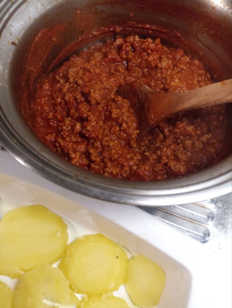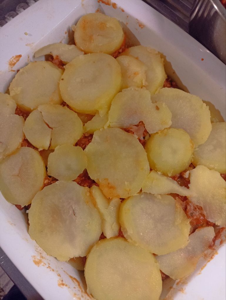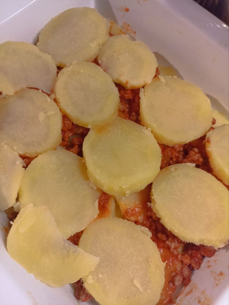 Oleate bene una pirofila e create uno strato di patate (precedentemente pelate e tagliate a fette), aggiungete alcune cucchiaiate di sugo di carne e proseguite alternando gli strati fino a esaurire tutti gli ingredienti.