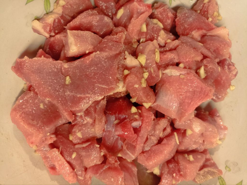 In una ciotola mettete il manzo, aggiungete l’aglio tritato, un cucchiaio di olio, un cucchiaino di farina e una spolverata di pepe. Mescolate e lasciate marinare per 30 minuti in frigorifero.