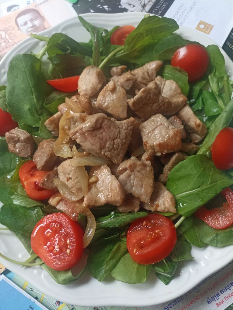 Questo manzo saltato è il re del “comfort food” khmer. La bellezza del Lok Lak sta nel contrasto: la carne, tenerissima, incontra la freschezza croccante della lattuga e dei pomodori, il tutto coronato dall’immancabile salsina di pepe e lime. In questa versione, ho cercato di racchiudere l’essenza di quei pranzi condivisi tra un tempio e l’altro, dove la semplicità degli ingredienti si trasformava in pura magia. È un piatto veloce, vibrante e perfetto per chi vuole portare un pizzico di esotismo a tavola senza complicarsi troppo la vita.