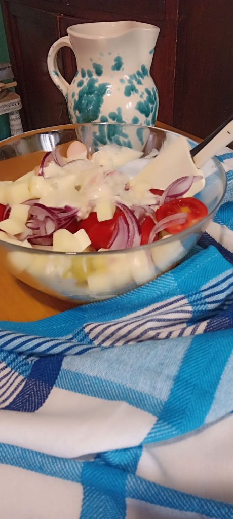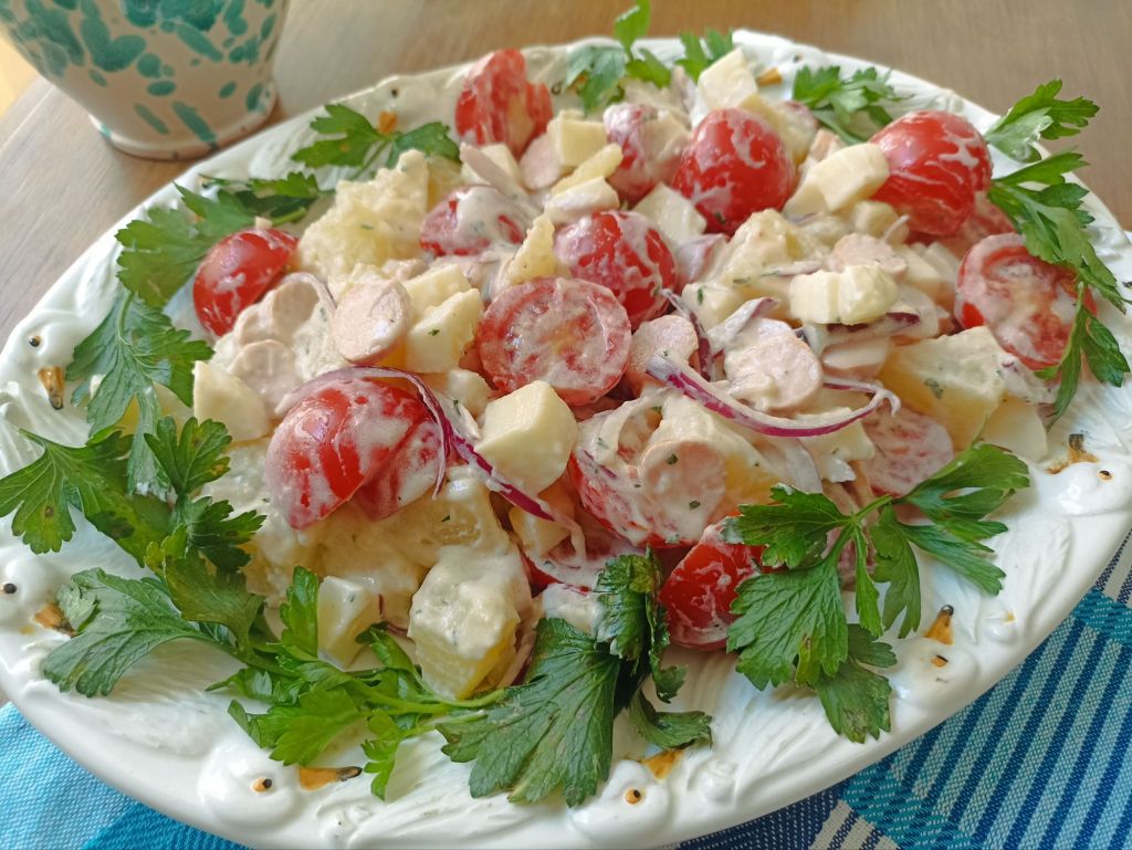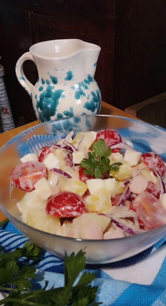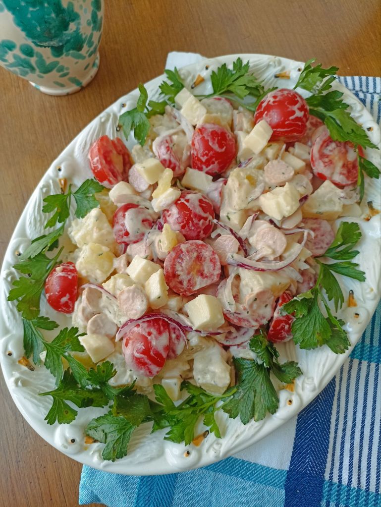 Questa non è la solita insalata di contorno, ma un incontro perfetto tra la croccantezza dell’orto e il calore di casa. Tipica dei Gasthof e della tradizione svizzera, si presenta come un mosaico di colori e consistenze: patate lesse tagliate a fette o cubetti, spesso ancora tiepide, che hanno assorbito il condimento diventando tenere e saporite, accompagnate dalla croccantezza della cipolla e la freschezza dei pomodorini. Ho aggiunto cubetti di Gruyèreche si fondono al sapore affumicato dei wurstel. Il tutto è avvolto da una dressing allo yogurt, una salsa vellutata dove l’acidità dell’aceto e la nobiltà dell’olio extravergine d’oliva legano gli elementi, rendendo ogni boccone fresco e cremoso senza risultare pesante È l’alternativa perfetta alla classica insalata di patate tedesca, resa più ariosa dalla salsa allo yogurt