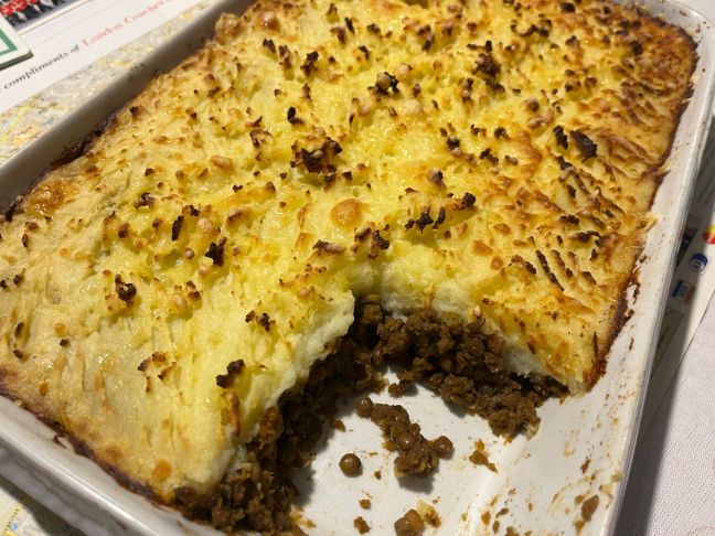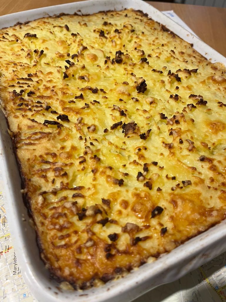 Aggiungete il cheddar grattugiato e con la forchetta create delle onde sulla superficie del purè. Cuocete in forno ventilato a 200° per 20-25 minuti. Sfornate quando il Cottage pie è ben dorato in superficie.