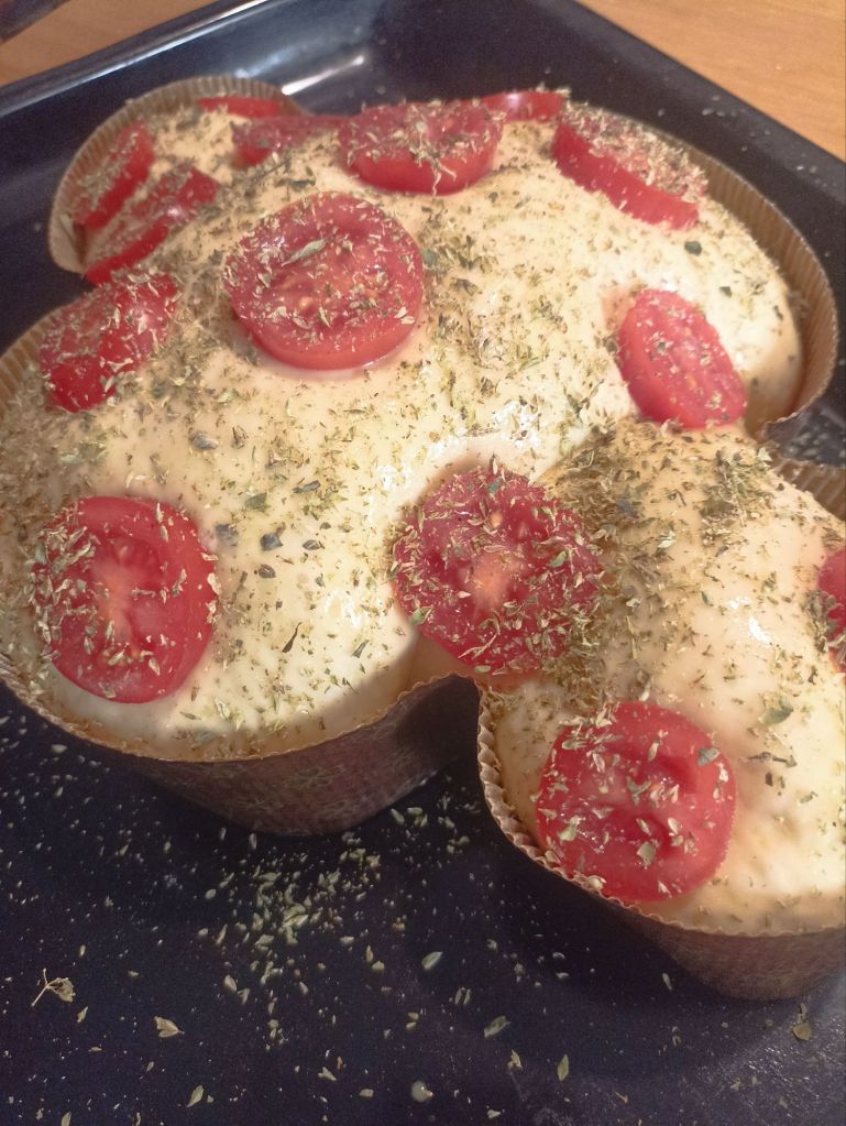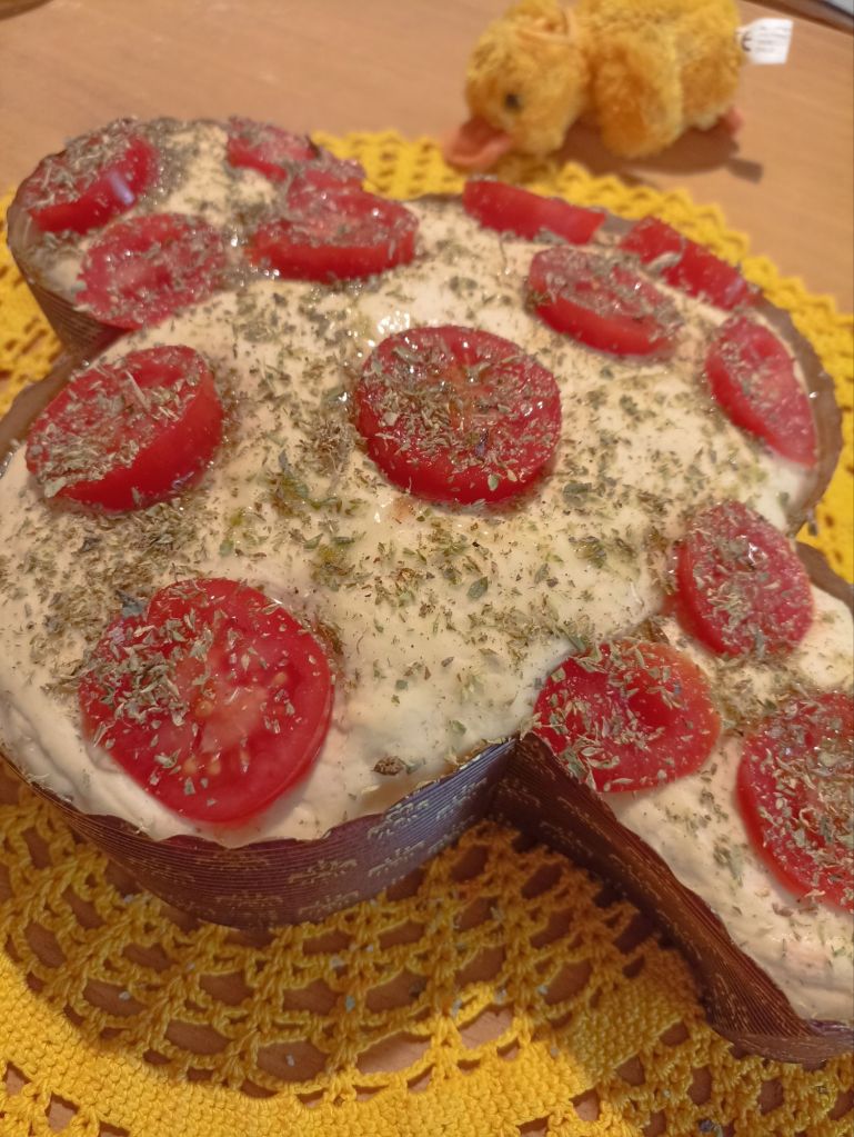 In una ciotola mettete la farina aggiungete al centro e lievito sciolto nel latte tiepido insieme allo zucchero. Mescolate con un cucchiaio fino a ottenere un composto grezzo. Aggiungete l’olio il sale e l’acqua, continuate a impastare per pochi minuti. Trasferite l’impasto sul piano da lavoro e continuate a lavorare per 10 minuti fino a ottenere un impasto liscio ed elastico. Ponete l’impasto in una ciotola oleata coprite e lasciate lievitare per un’ora e mezza-2 fino al raddoppio del volume ( nel forno con la lucina accesa). Trascorso il tempo di lievitazione dividete l’impasto, fate un giro di pieghe, formate un filoncino e sistematelo nella parte centrale dello stampo della colomba. Formate il secondo filoncino e ponetelo sopra per le ali Lasciate lievitare nuovamente per un’ora in forno con la lucina accesa, (deve quasi raggiungere il bordo). Spennellate con il tuorlo d’uovo e latte, posizionate i pomodorini, spolverate con abbondante origano.