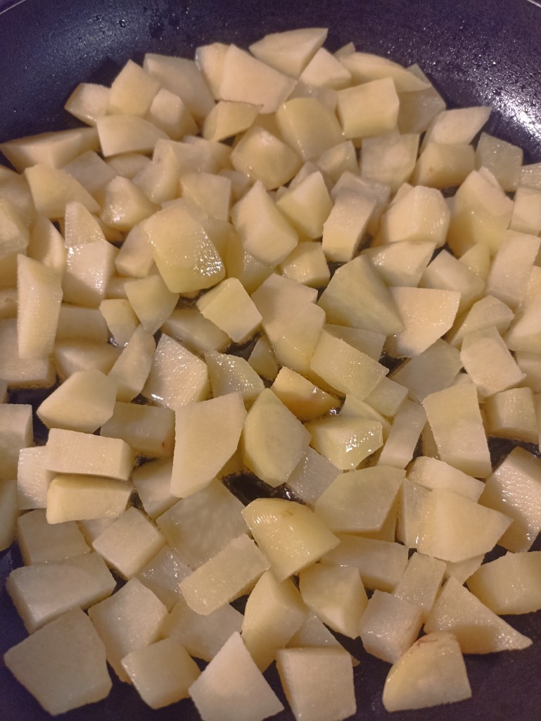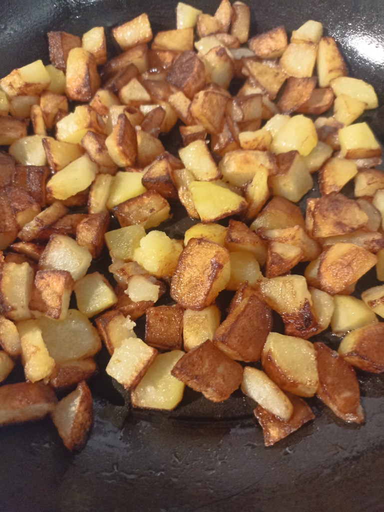 Saltate i cubetti di patate in padella con olio finché non sono dorati e croccanti fuori (ma teneri dentro).
