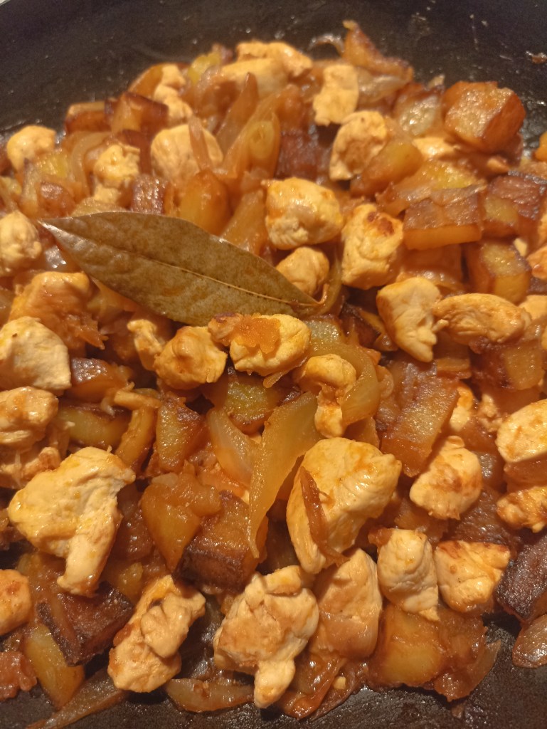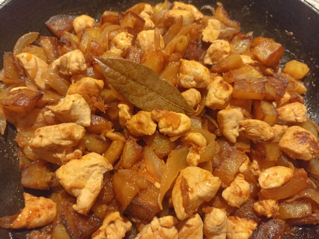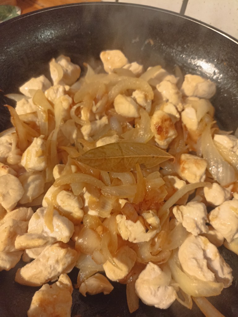 Mettetele da parte. Nella stessa padella, rosolate i bocconcini di pollo con le cipolle affettate, l’aglio tritato e la foglia di alloro.